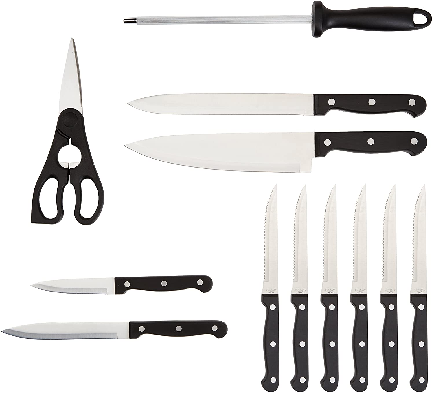- 14-piece set includes (11) knives, (1) pair kitchen scissors/shears and (1) knife sharpener neatly stored within (1) pine knife block.