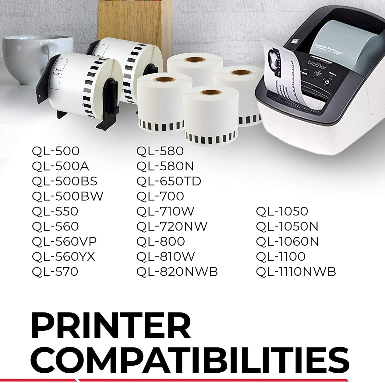 - PRINTER COMPATIBILITIES – Brother DK Label Printers QL-500, QL-500A, QL-500BS, QL-500BW, QL-550, QL-560, QL-560VP, QL-560YX, QL-570, QL-580, QL-580N, QL-650TD, QL-700, QL-710W, QL-720NW, QL-800, QL-810W, QL-820NWB, QL-1050, QL-1050N, QL-1060N, QL-1100, QL-1110NWB