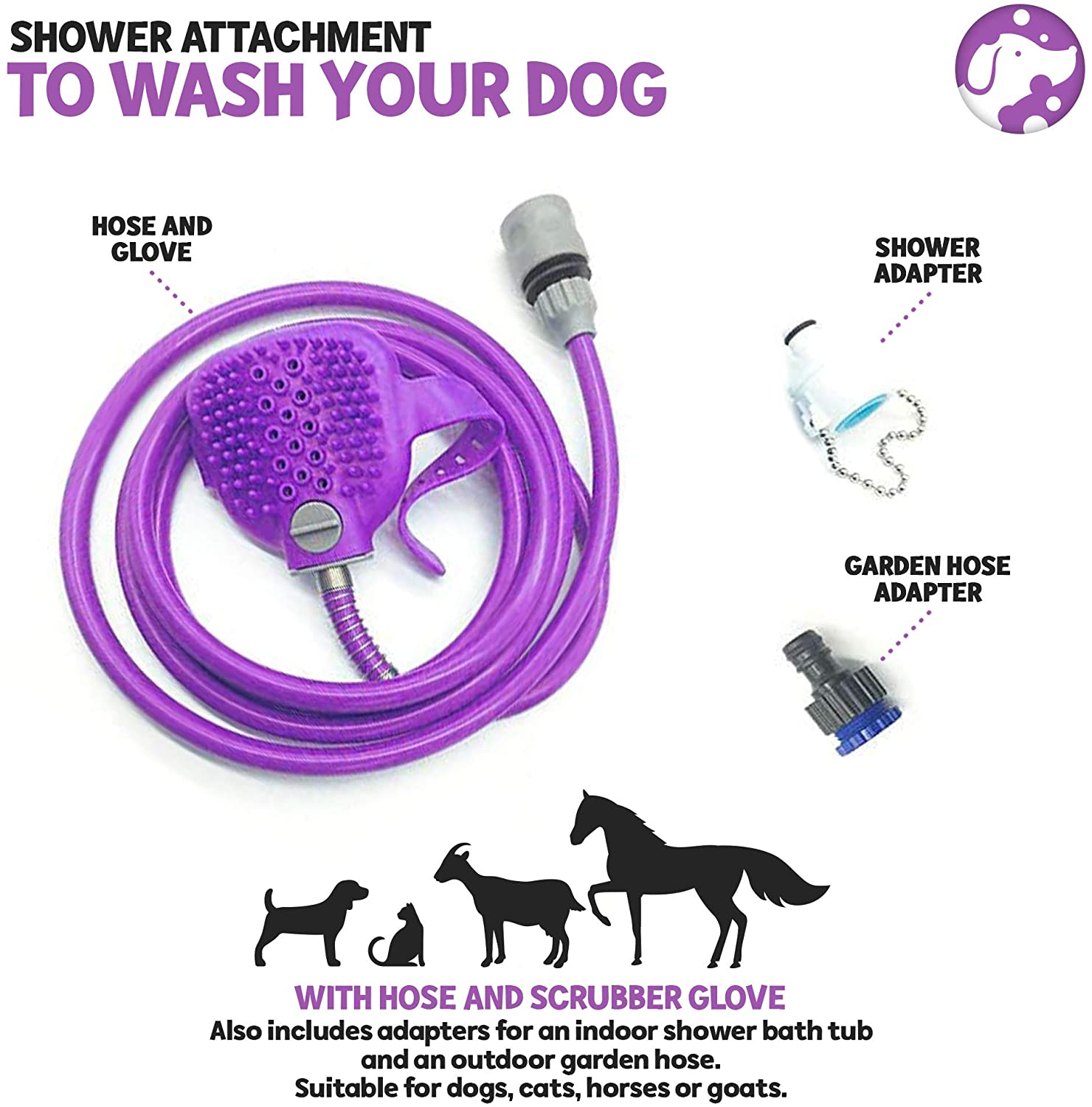 • INDOOR AND OUTDOOR: This dog washing shower attachment includes adapters for an indoor shower bath tub and an outdoor garden hose. Suitable for dogs, cats, horses, or goats, this shower tool speeds up bath time and reduces the amount of water used.
