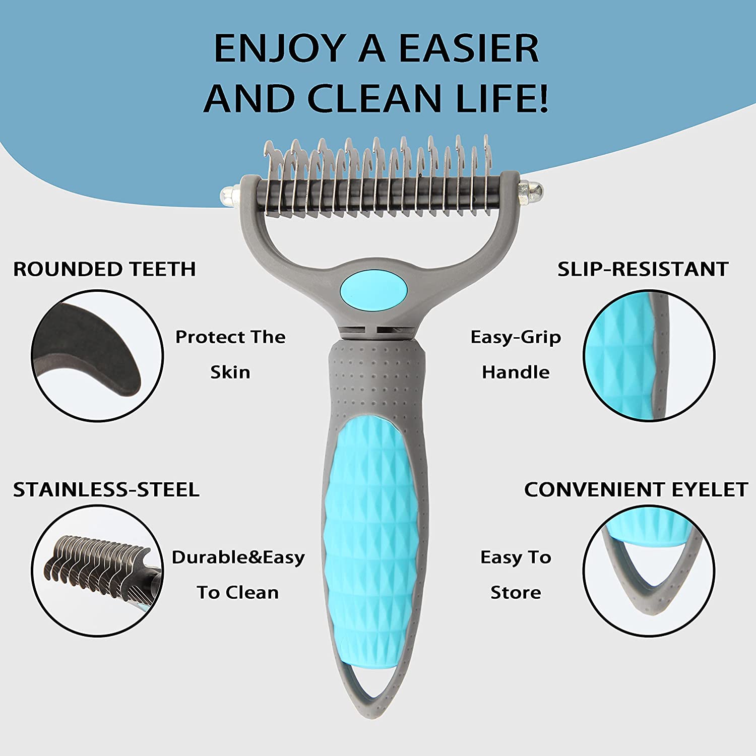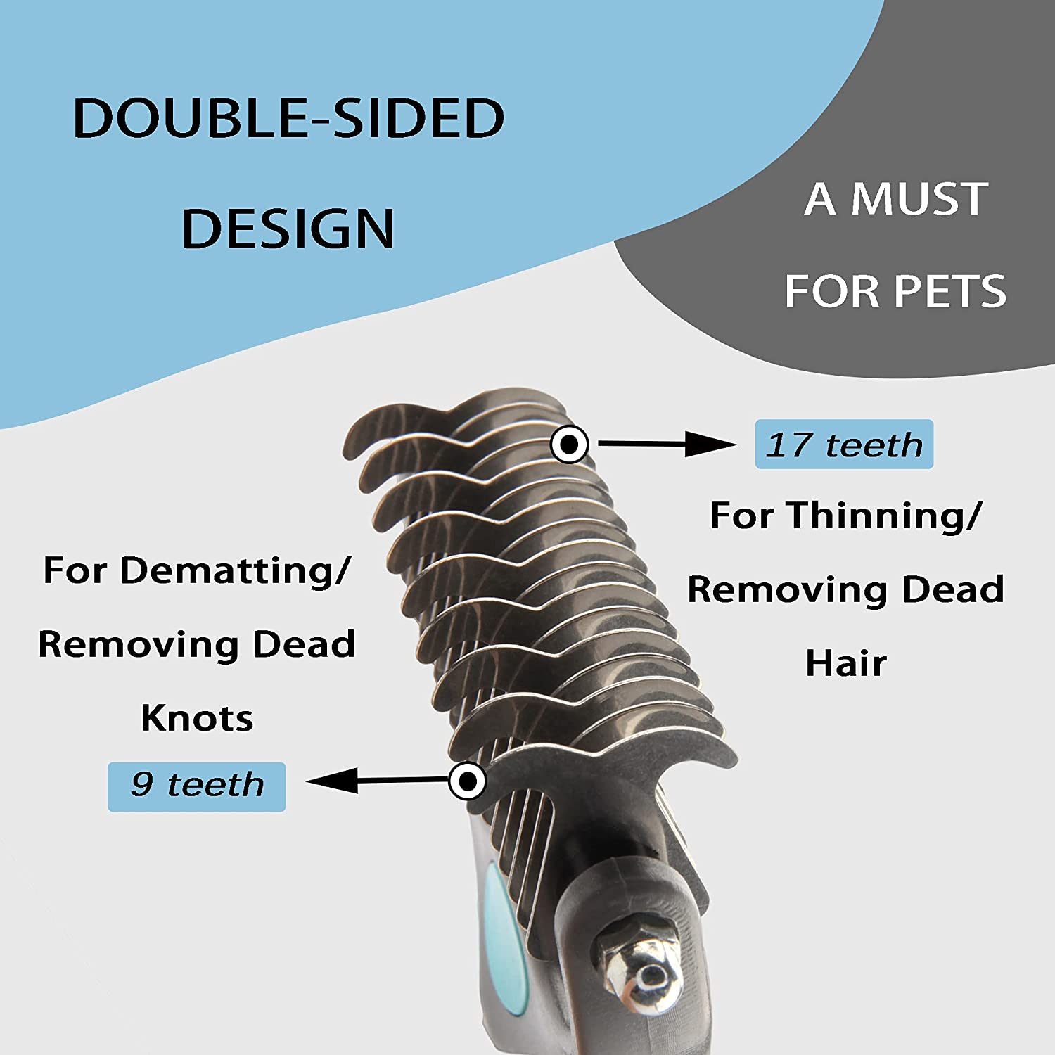 - Protect the Skin: The serrations of the undercoat rake comb are smooth outside and sharp inside, which can easily remove the hair blockages without damaging your pet’s skin.